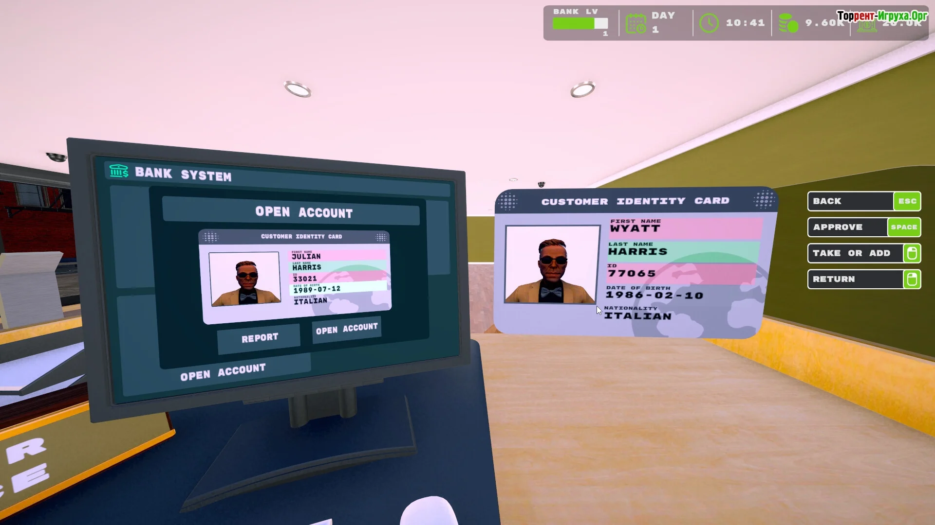 Игрок управляет офисом банка, нанимает сотрудников и проводит ежедневные операции: открытие счетов, приём вкладов, выдачу наличных и обслуживание клиентов. Система задач позволяет контролировать работу через специальный планшет, помогая эффективно распределять ресурсы.